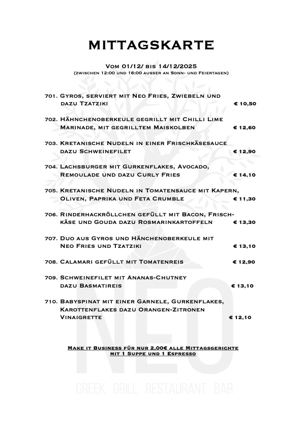 Make it Business für nur 1.50€ alle Mittagsgerichte mit 1 Salat und 1 Espresso